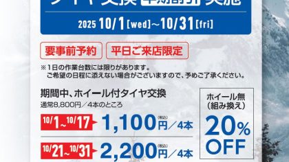 こんにちは。ボルボ・カー盛岡でございます。タイヤ交換早期割引キャンペーンのご案内です。 10月1日(水)~10月31(金)の期間、タイヤ交換早期割引キャンペーンを実施します。 キャンペーン期間中の割引料金が異なりますのでご注意ください。*ホイー...